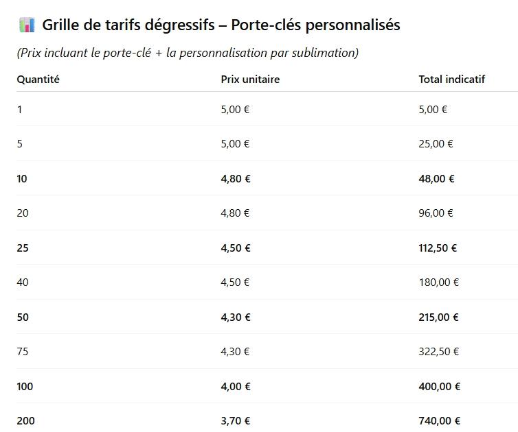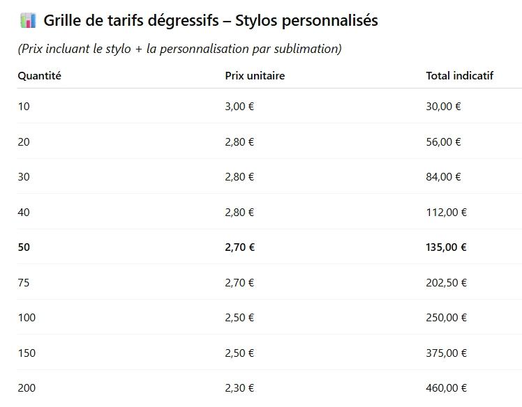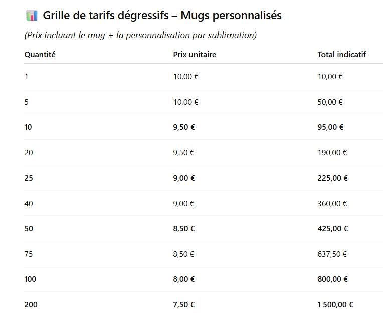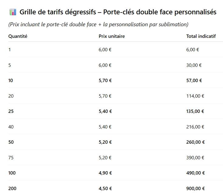 • Prix unitaires incluant la personnalisation par sublimation